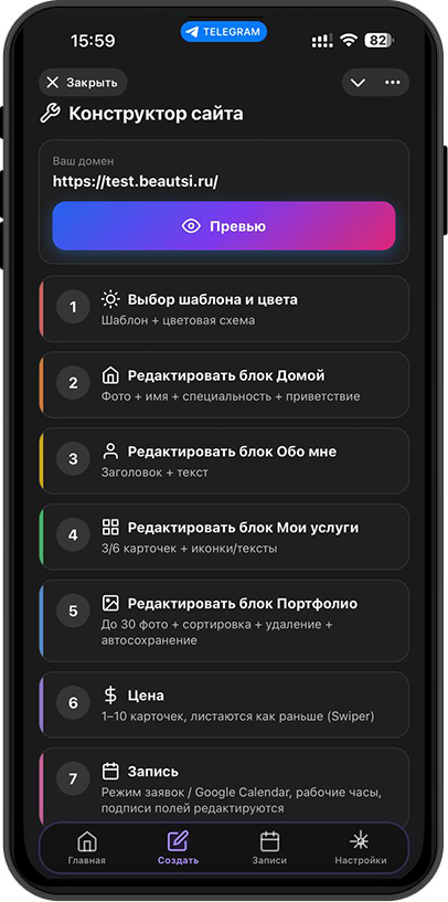 Создавай сайт, принимай заявки и управляй услугами через Telegram-бот