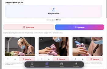 На вкладке «Создать» вы собираете сайт шаг за шагом: выбираете шаблон, настраиваете блоки и сразу видите результат — без лишних действий и технических сложностей.